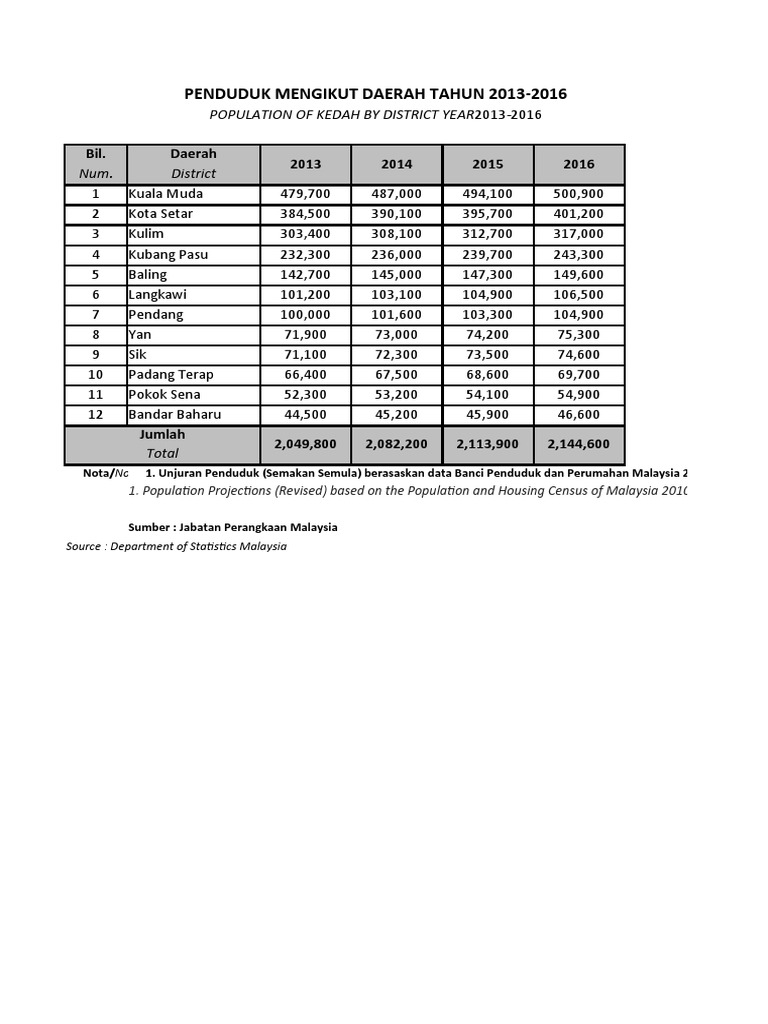 Jumlah Penduduk Kedah Mengikut Daerah 2013 2016 Pdf